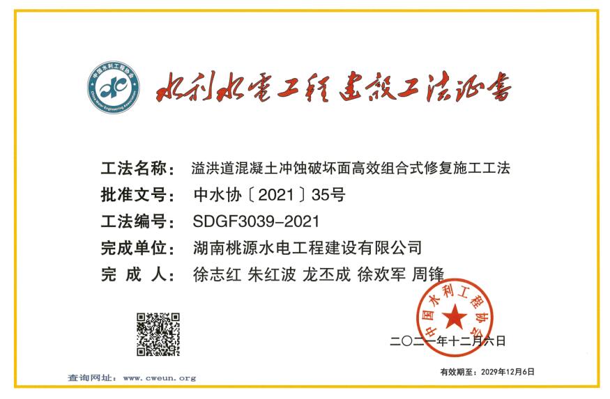公司所承建的2018年度黄石水库除险加固工程获中水协工法成果批准